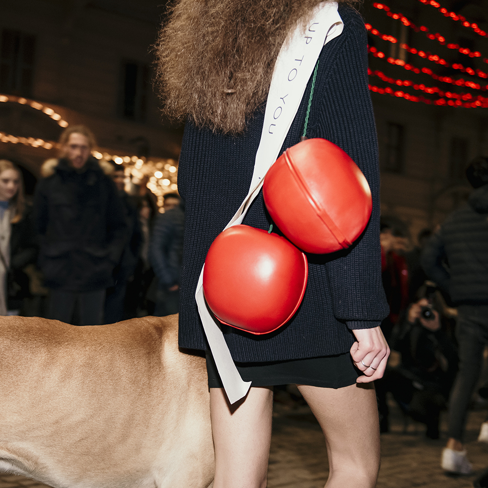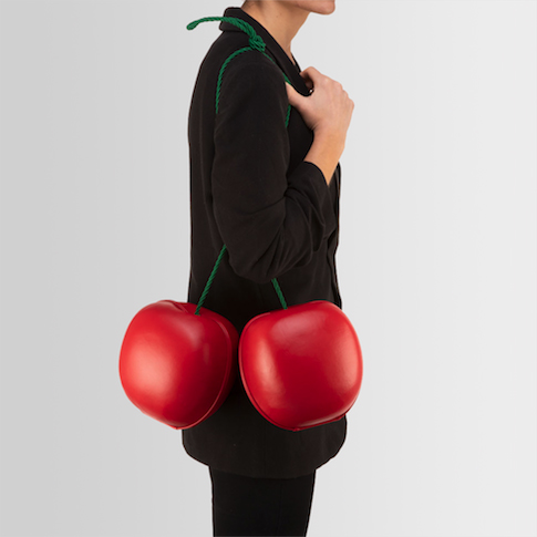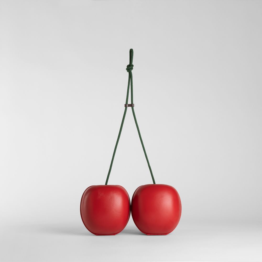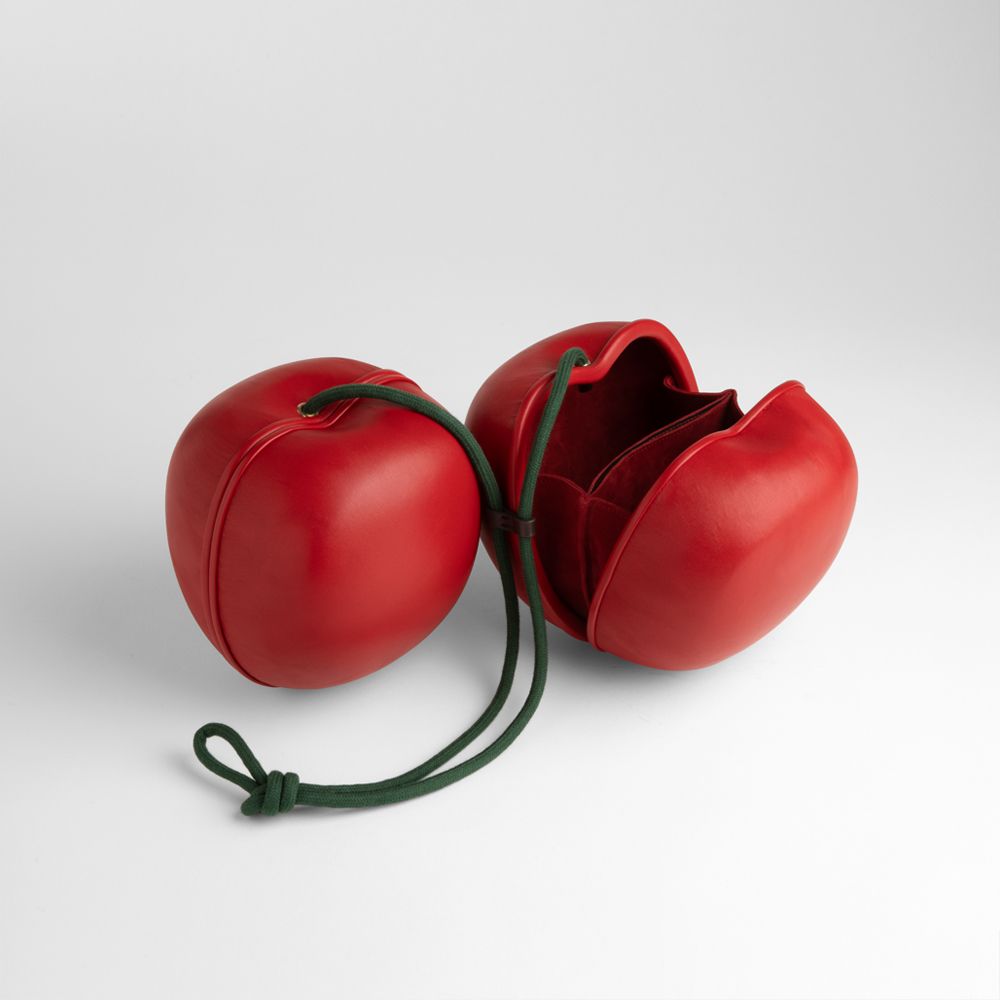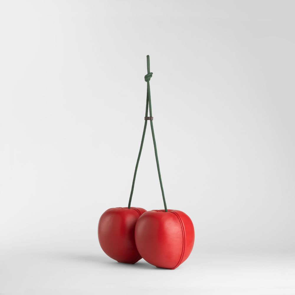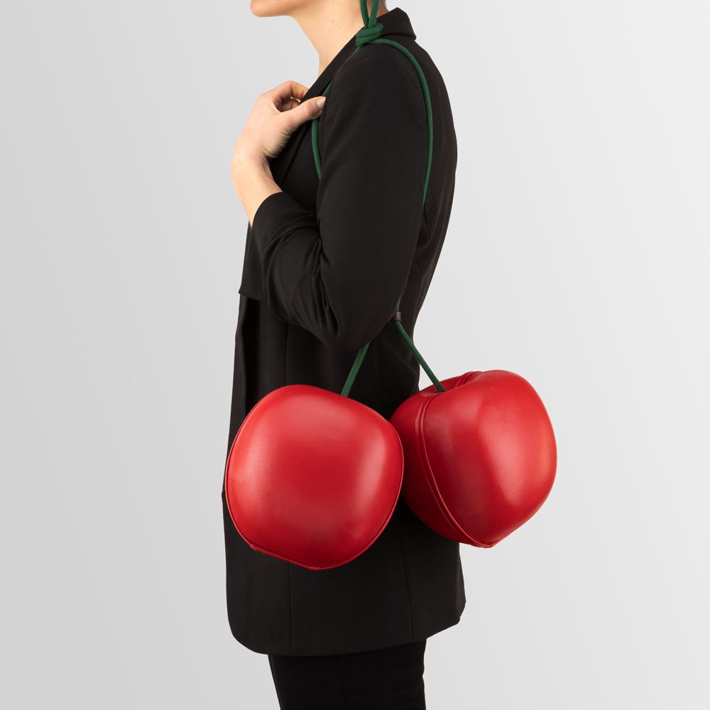 Two leather bags with cherry shape produced with laborious craftsmanship. Green shoulder strap in thick rope and snap closure. Wearable on the shoulder.
