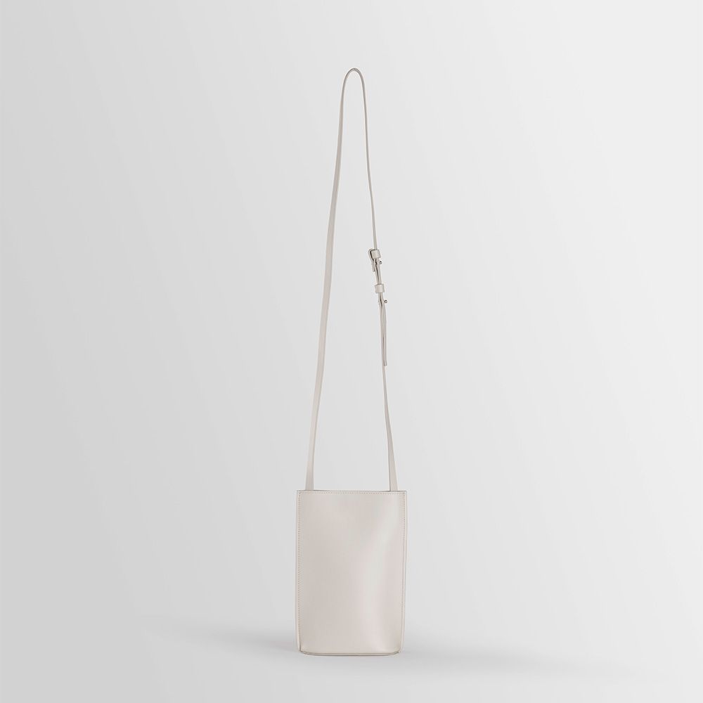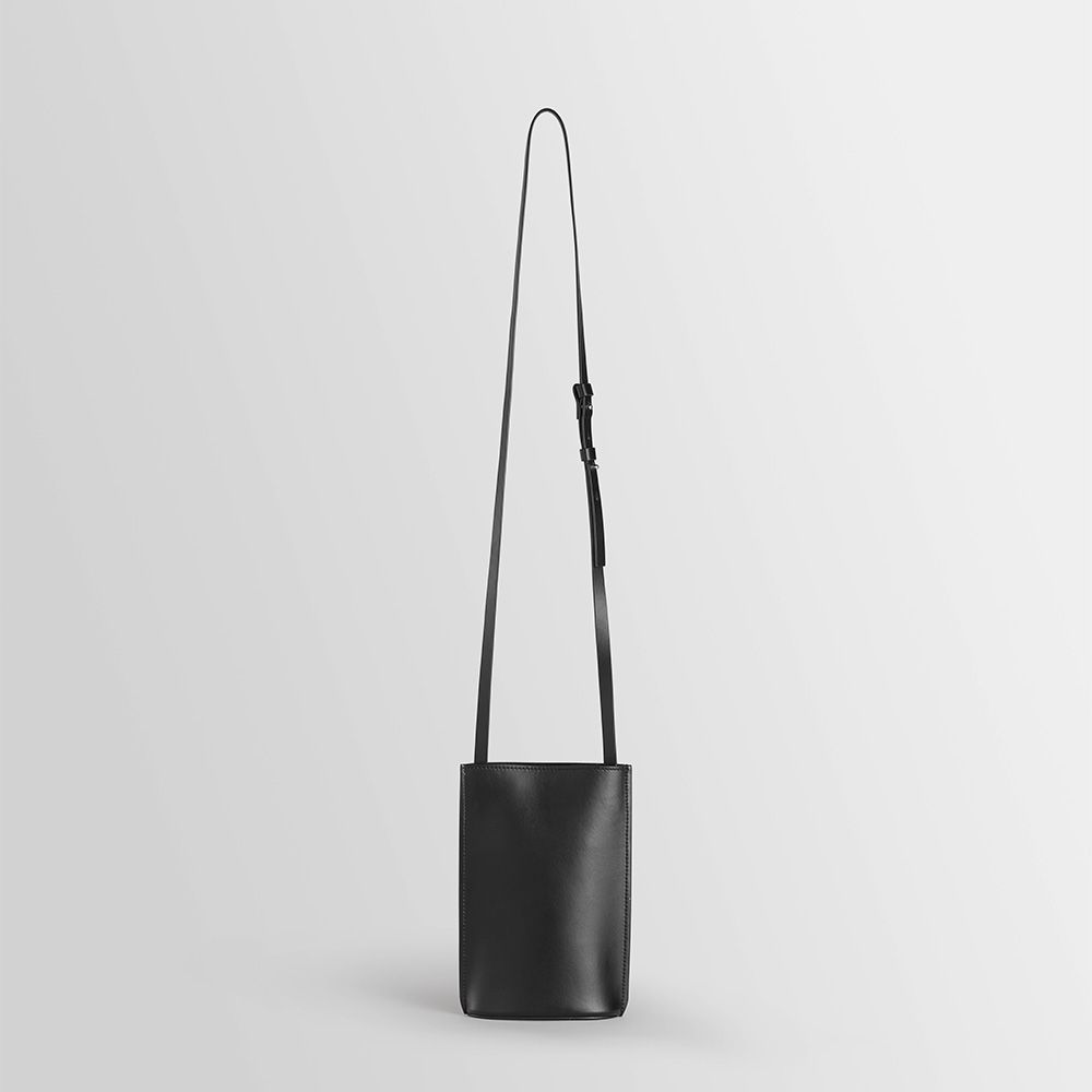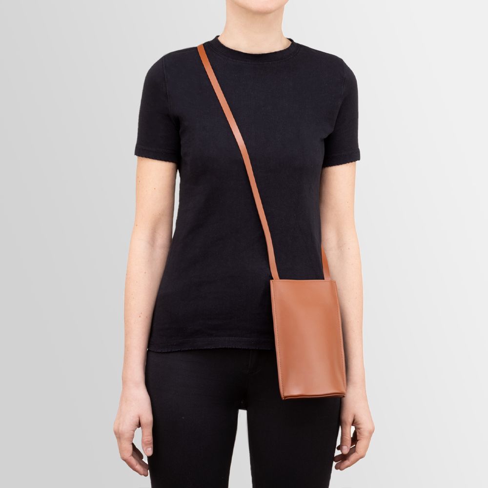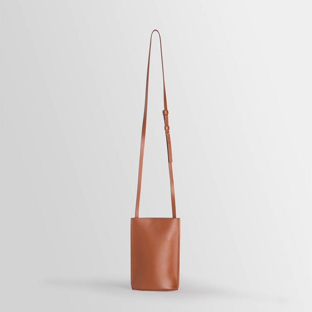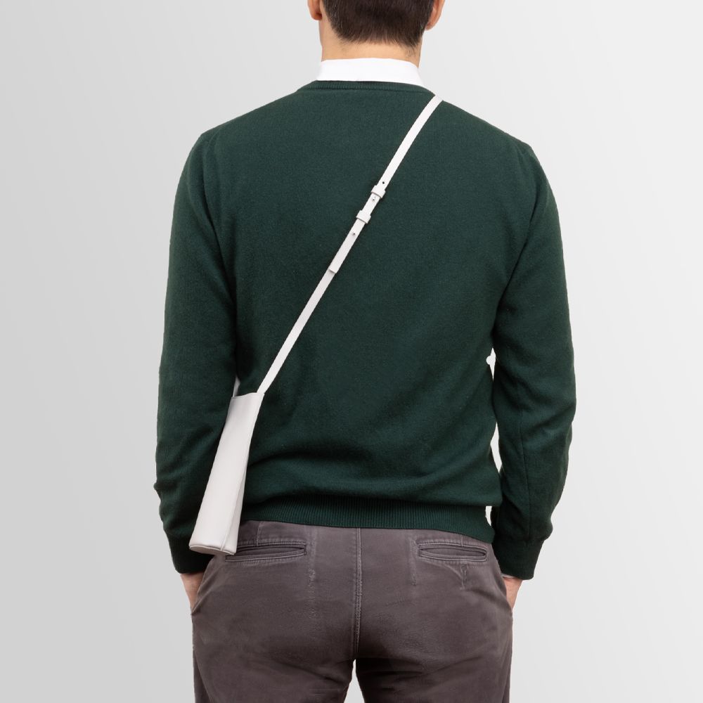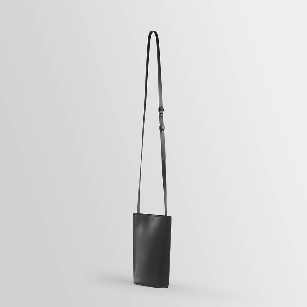Leather pouch equipped with adjustable strap and hidden magnetic clasp. Oval-shaped base. Wearable on the shoulder. Fits smartphones, passport and other documents, sunglasses, keys or cards.