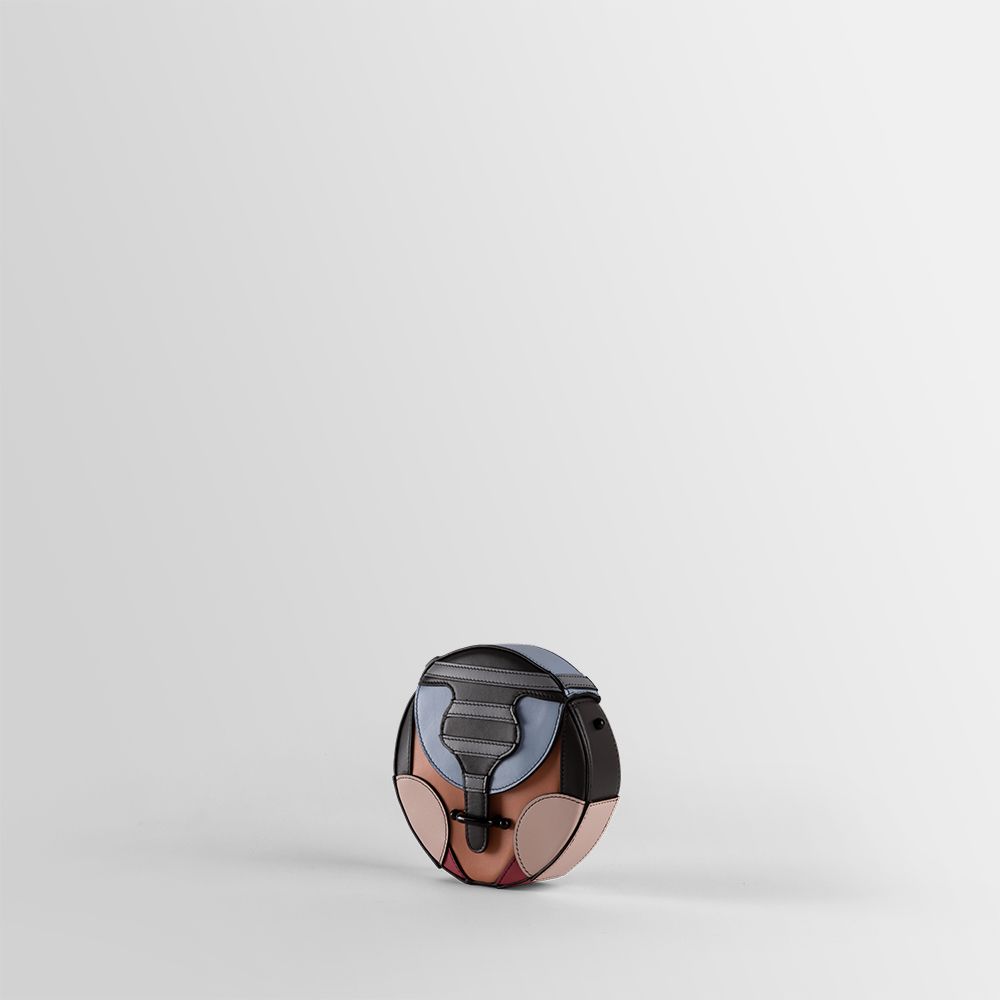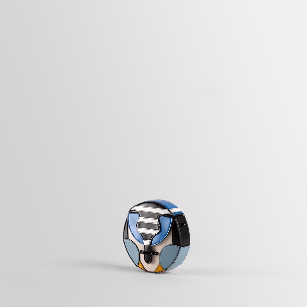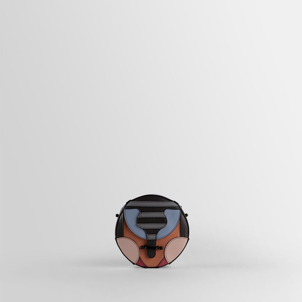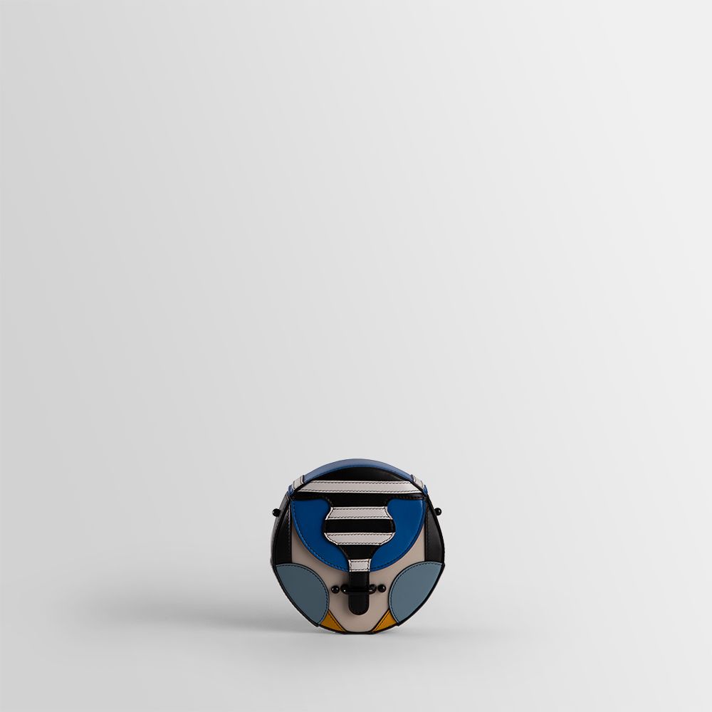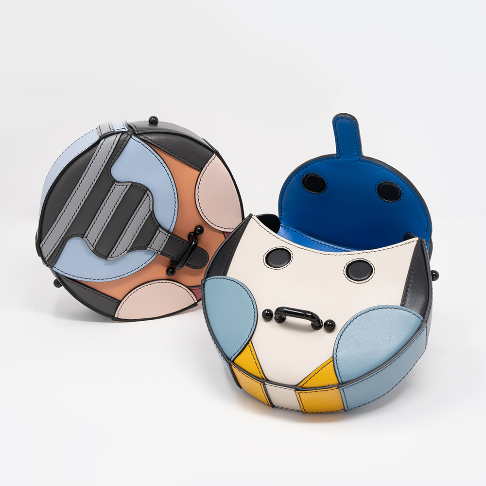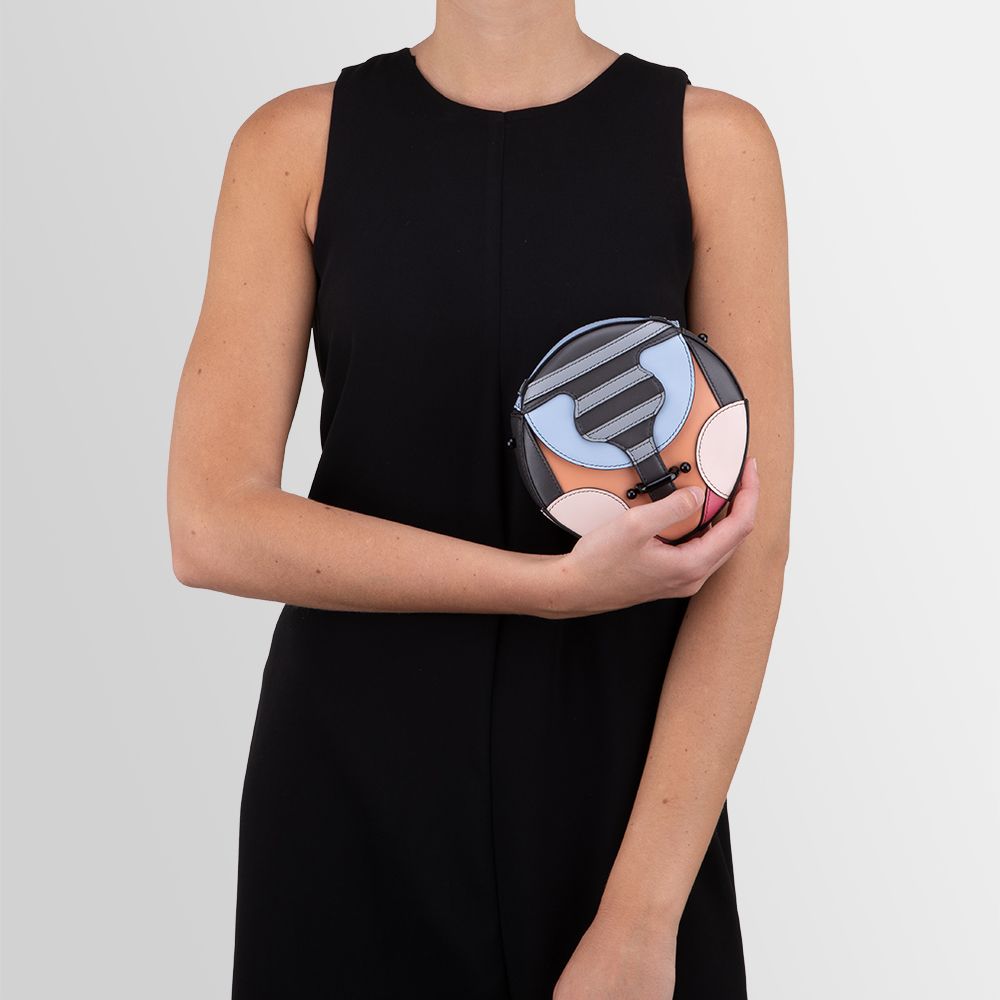The idea came by chance while playing with my daughter: a small cylindrical kaleidoscope inspired me to enclose an infinity of colours within a perfect shape, a circle. A circle full of colours that, when put on a white sheet, begins to take on the most disparate appearances, getting closer and closer to a face, to a mask. The colours change into textures, into geometric layers of superimposed fabric, like an artistic composition. The result is a young, contemporary, fresh bag suitable for everyday life with its infinite compositions thanks to the materials and colours used.