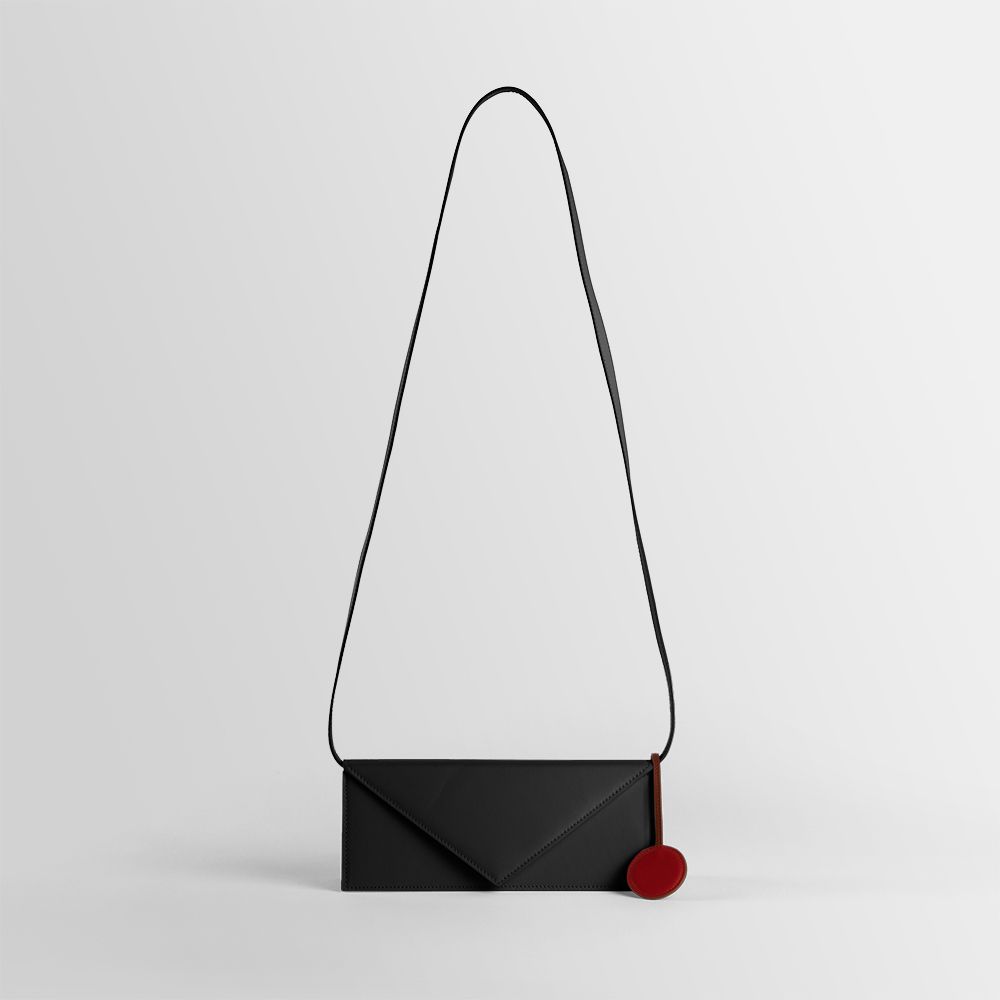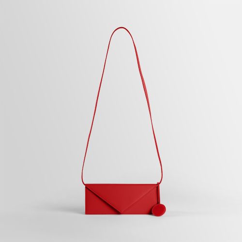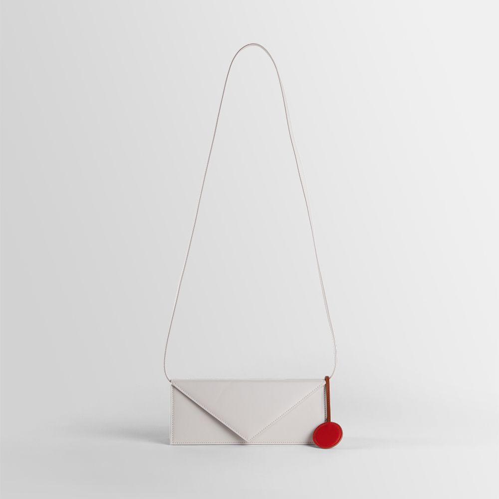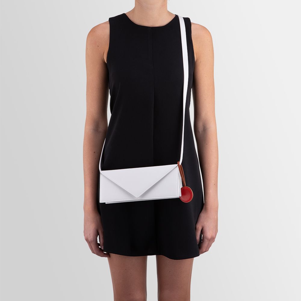 Small rectangular bag with the shape of an envelope. Equipped with removable shoulder strap, a triangular flap and magnetic button closure. Inner zipped and slit pockets. Wearable on the shoulder and by hand.