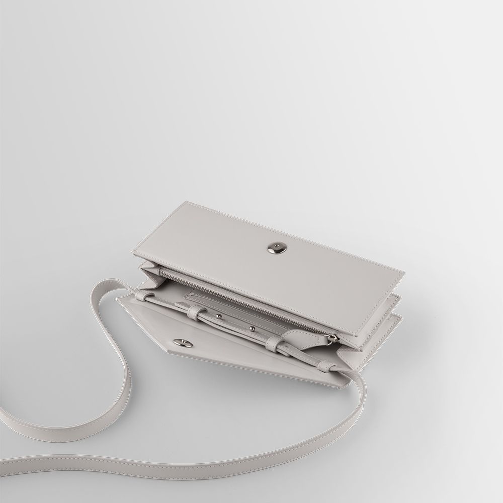 Small rectangular bag with the shape of an envelope. Equipped with removable shoulder strap, a triangular flap and magnetic button closure. Inner zipped and slit pockets. Wearable on the shoulder and by hand.