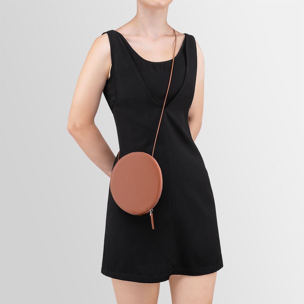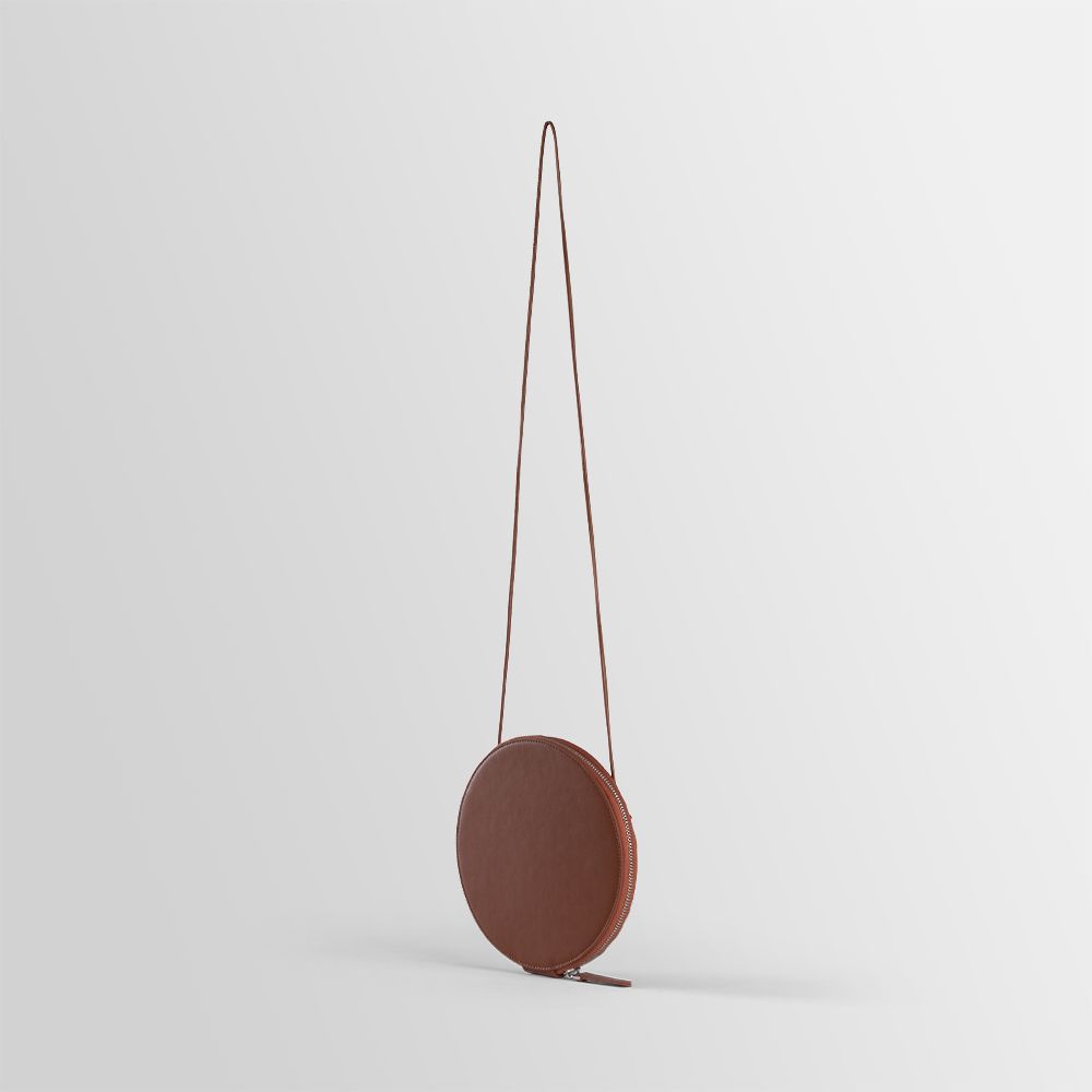 Circle shaped leather pochette with all-around zipper. Equipped with inner card holder compartments. Removable leather string. Wearable on the shoulder and by hand.