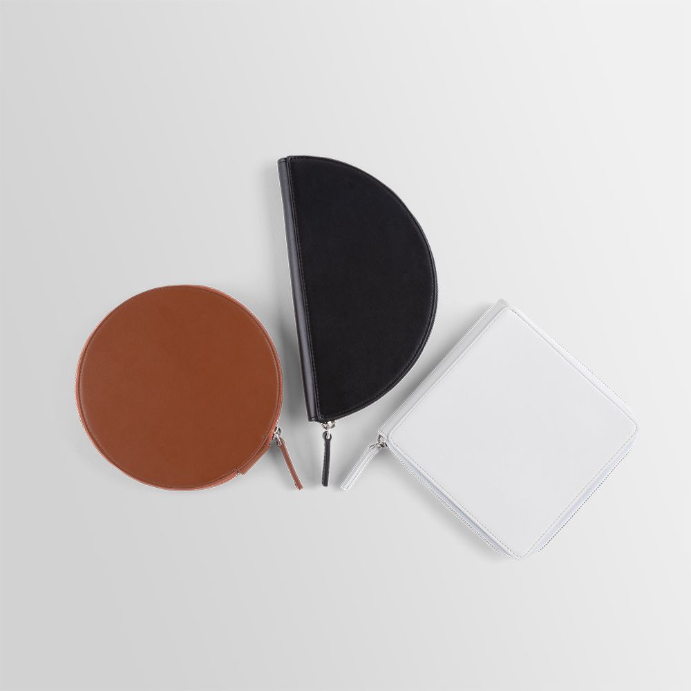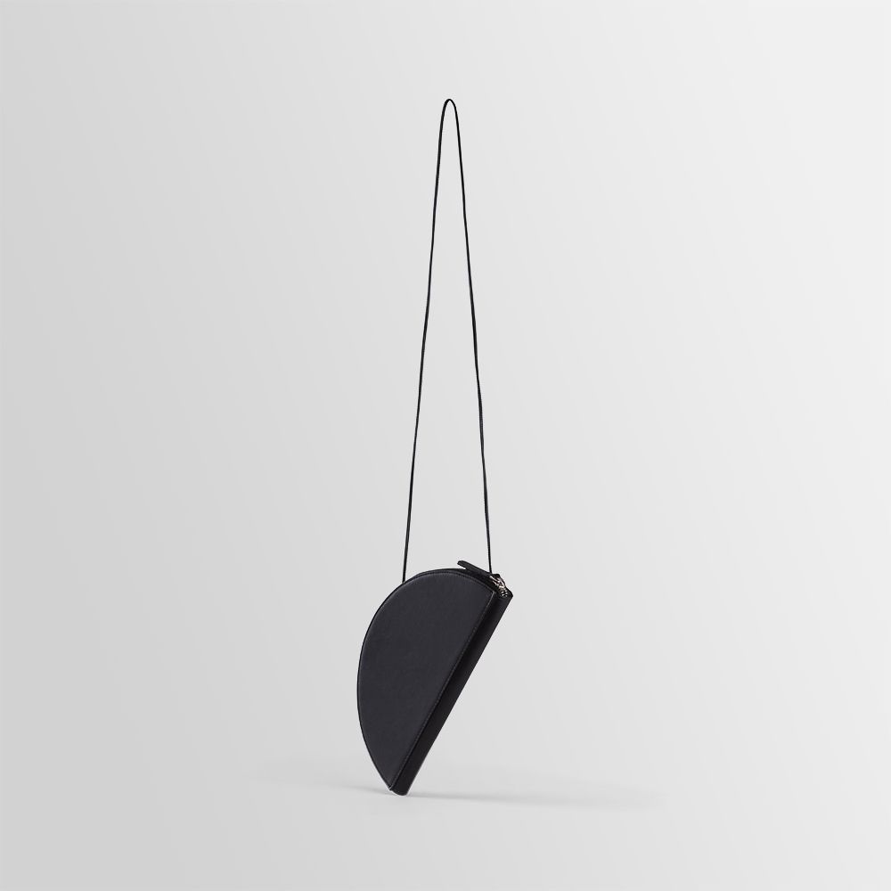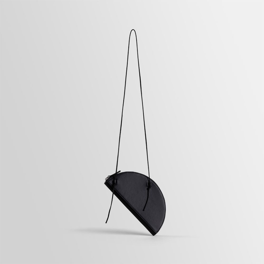 Half-circle shaped leather pochette with top zipper. Equipped with inner card holder compartments. Removable leather string. Wearable on the shoulder and by hand.