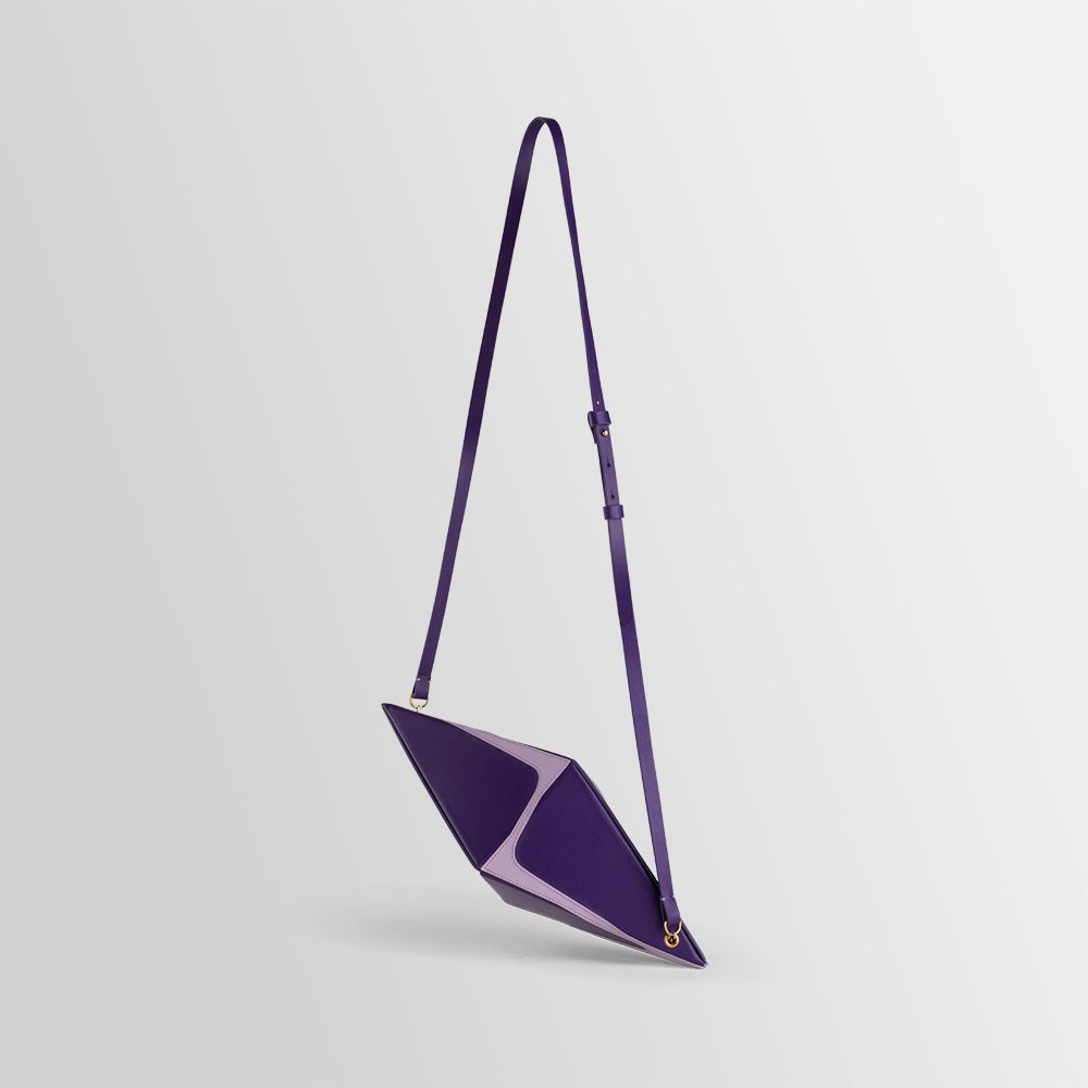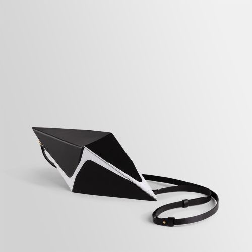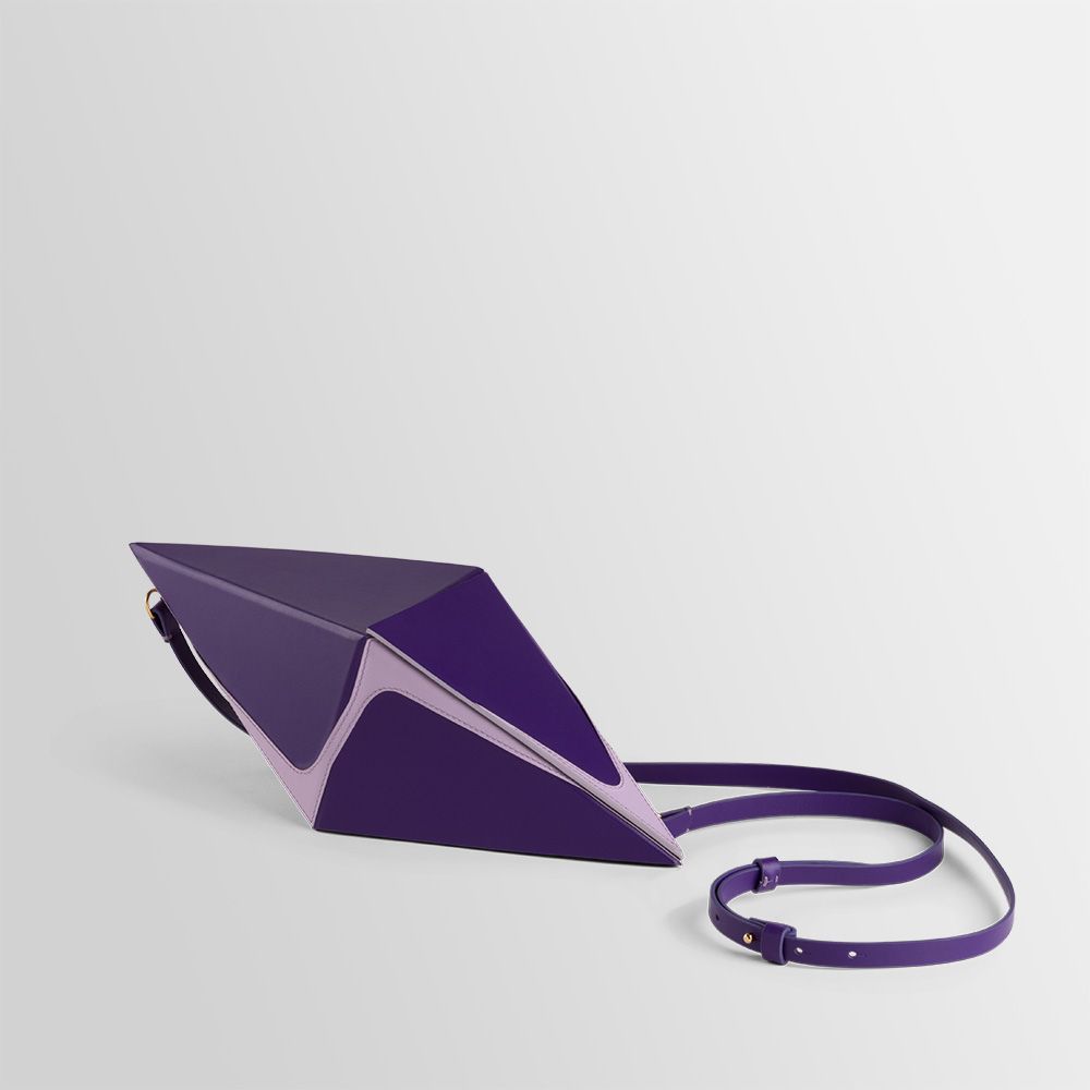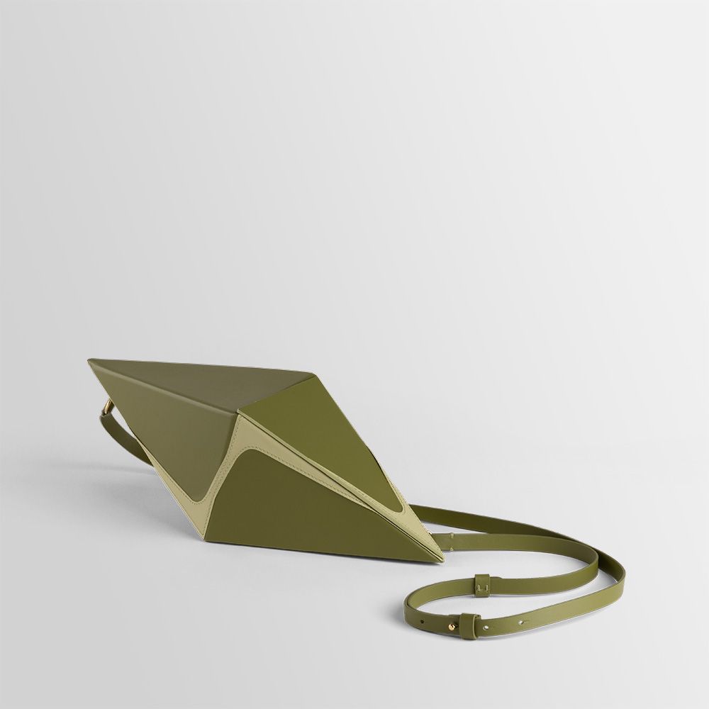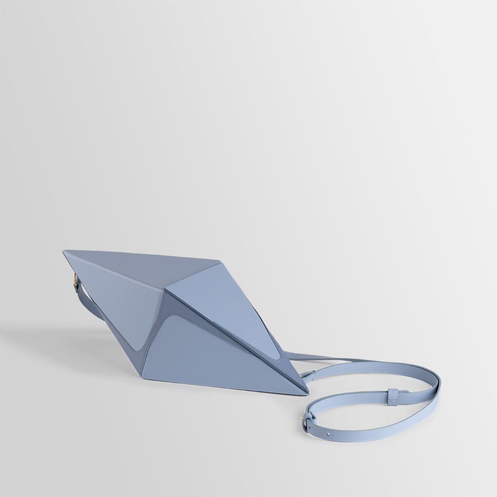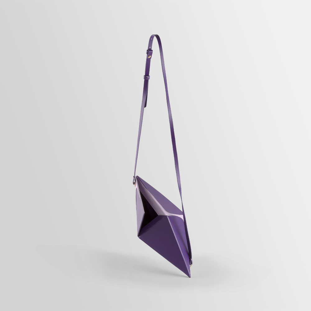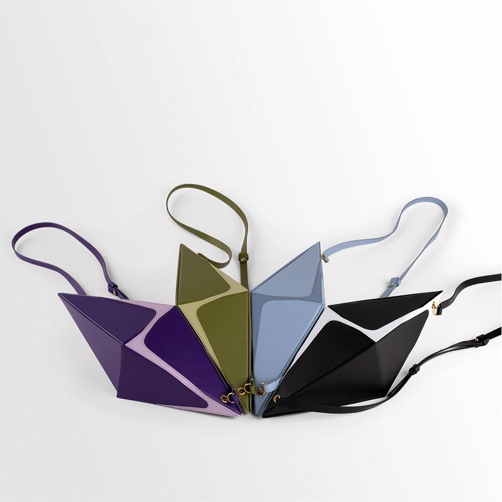 This collection of bags is a combination of some geometrical elements. The Pyramid, Cube and Octahedron are combined with an hyperbolic function that gives a twist to the rigorous precise shape.