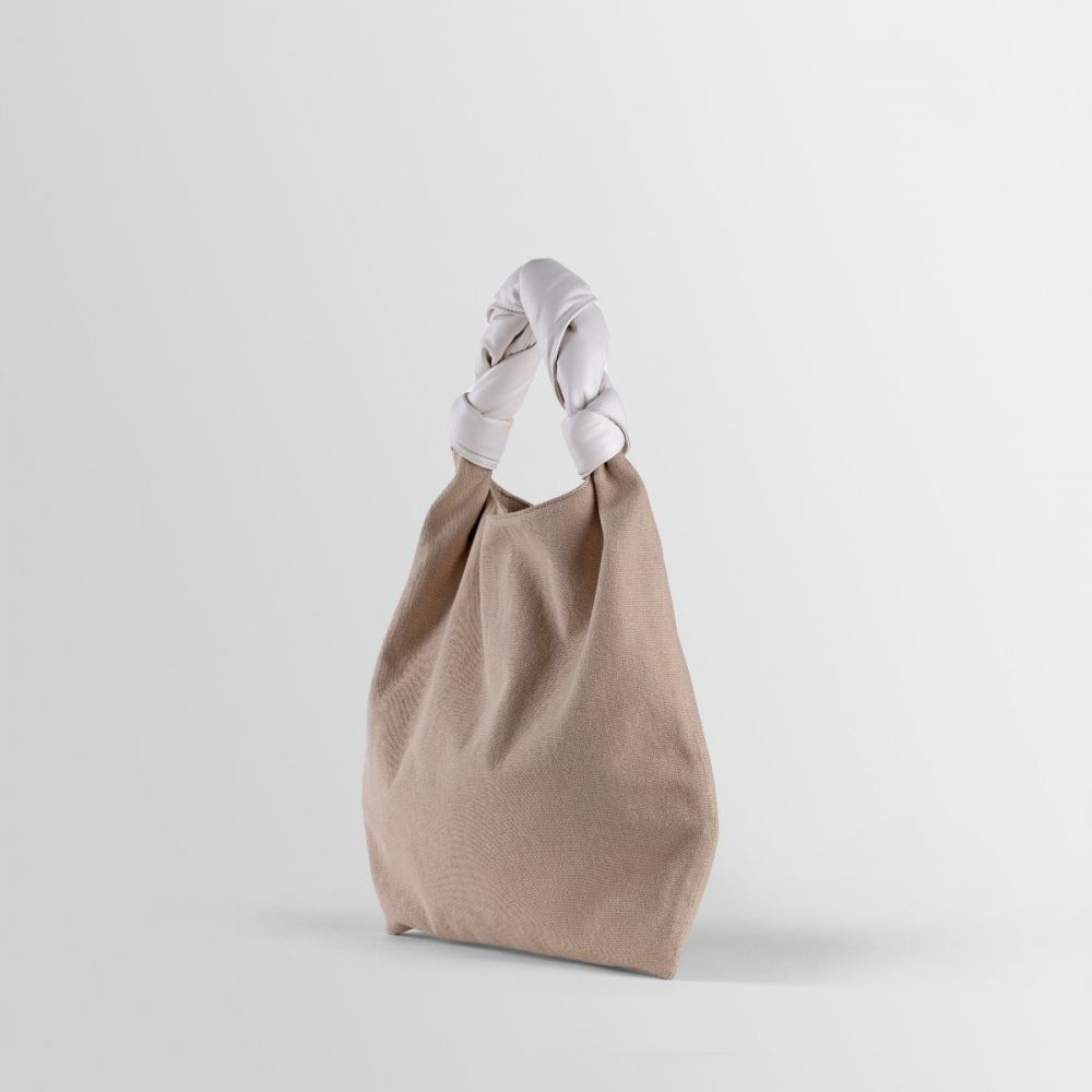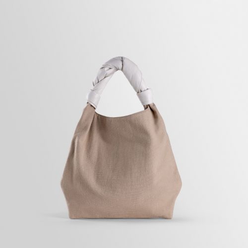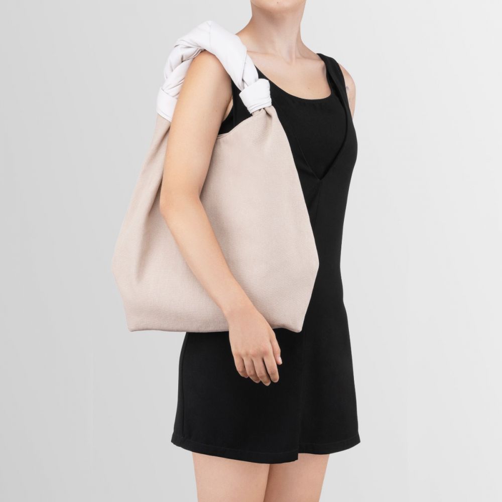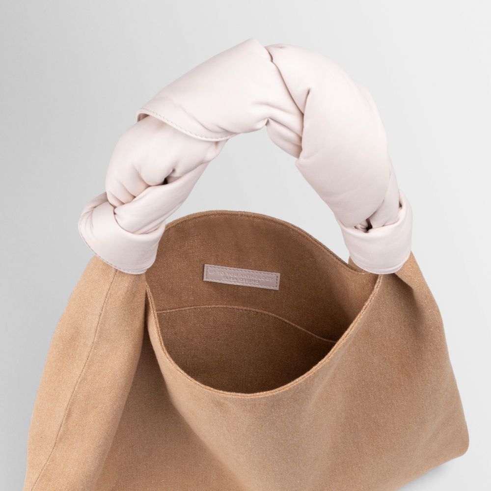 Sacca was inspired by the technique behind Furoshiki bags, made by knotting fabric by hand. It is characterized by its wide capacity and by the contrast between the texture of the canvas and the softness of the nappa leather. The soft woven handle makes it extremely comfortable and iconic.