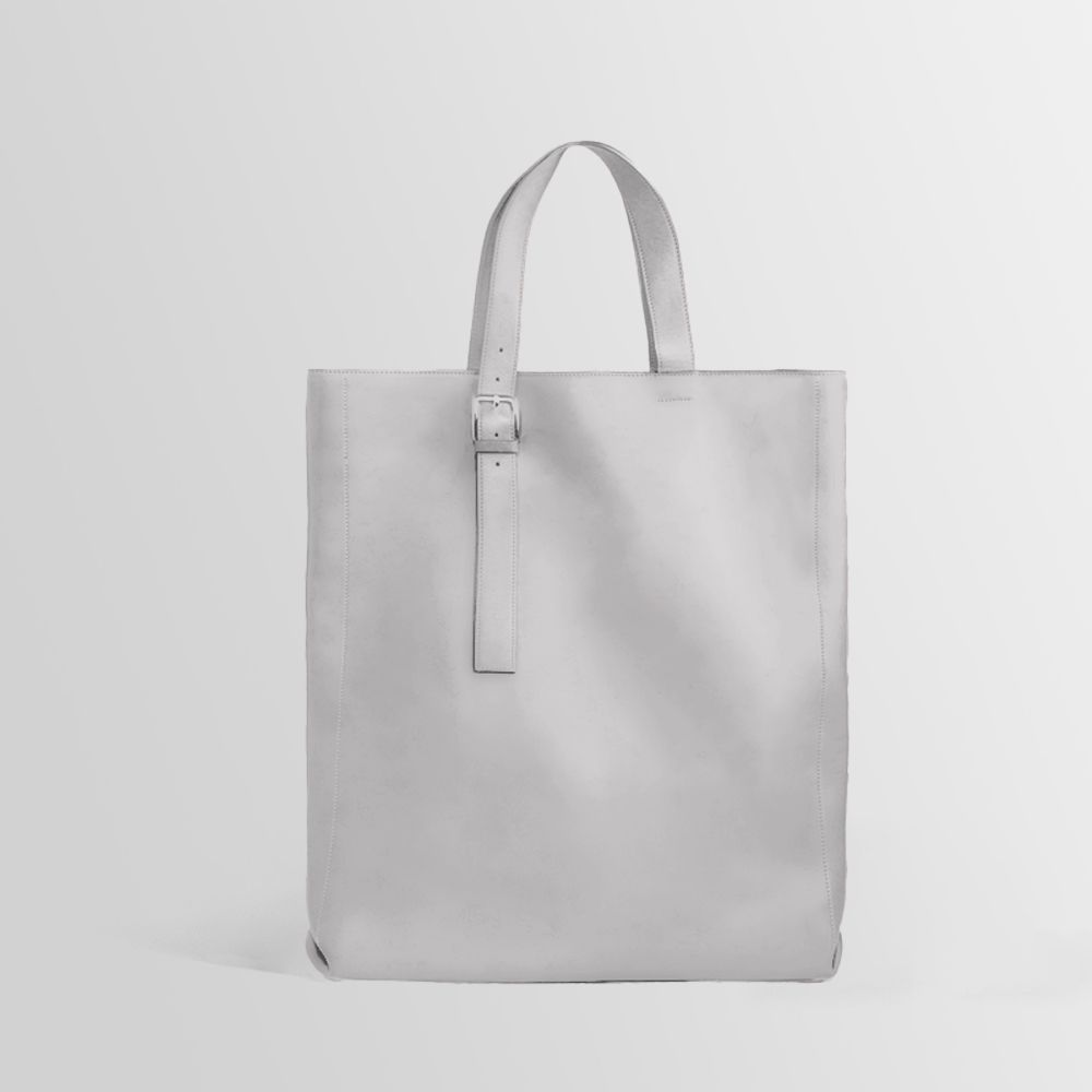 Tote bag with squared shape in smooth leather with two handles. Silver buckle and deatils. Equipped with inner pocket, keyring holder and detachable leather pouch. Wearable on the shoulder.