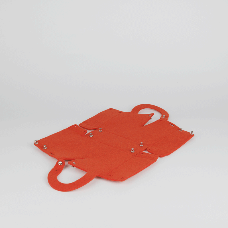 The bag was designed as a single cut sheet that can be distributed completely flat. Without any tools customers can fold and assemble it into a three-dimensional bag, just by joining a few rivets through the holes in the bag. This simplifies the manufacturing process and minimizes inventory and shipping costs, allowing a wide range of colours, sizes and shapes. The bags come in two types of materials: genuine saddle leather or recycled felt. This felt is made from 100% recycled PET resin. Because of its form, this bag can be counted as one sheet, two sheets, or, in Japanese, ichi-mai, ni-mai, … and thus, the bag was named “mai”.